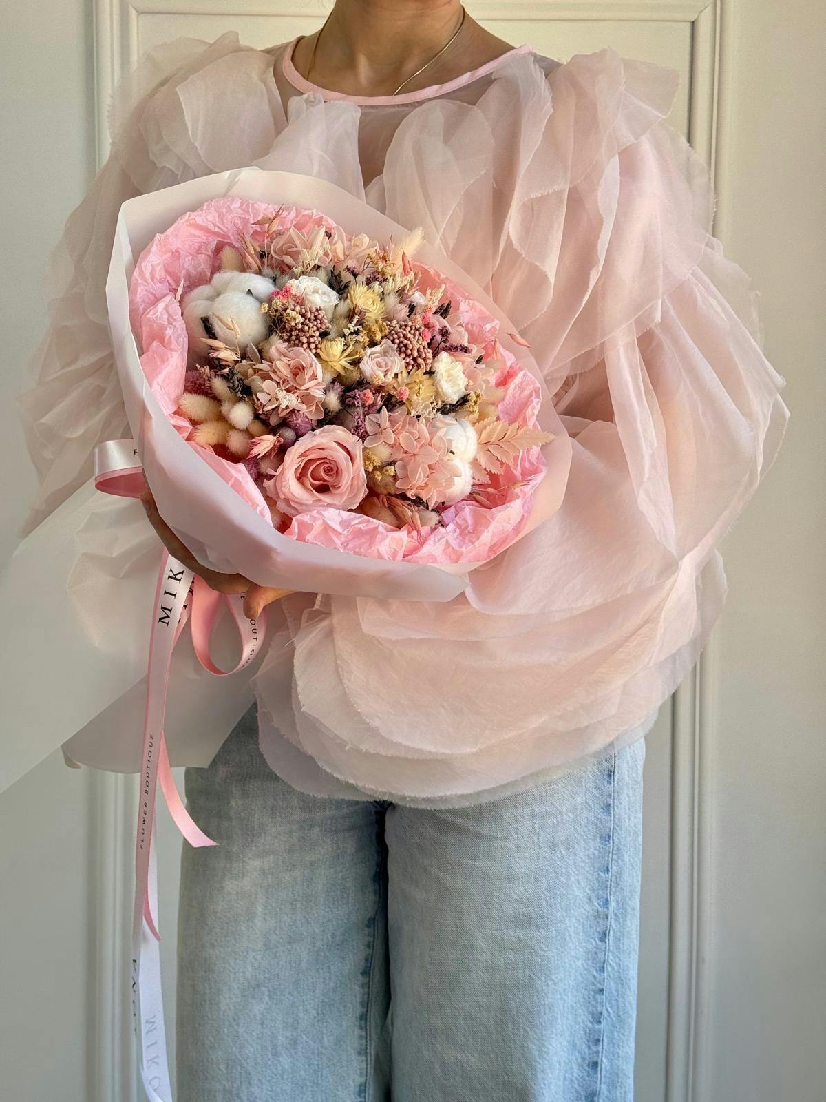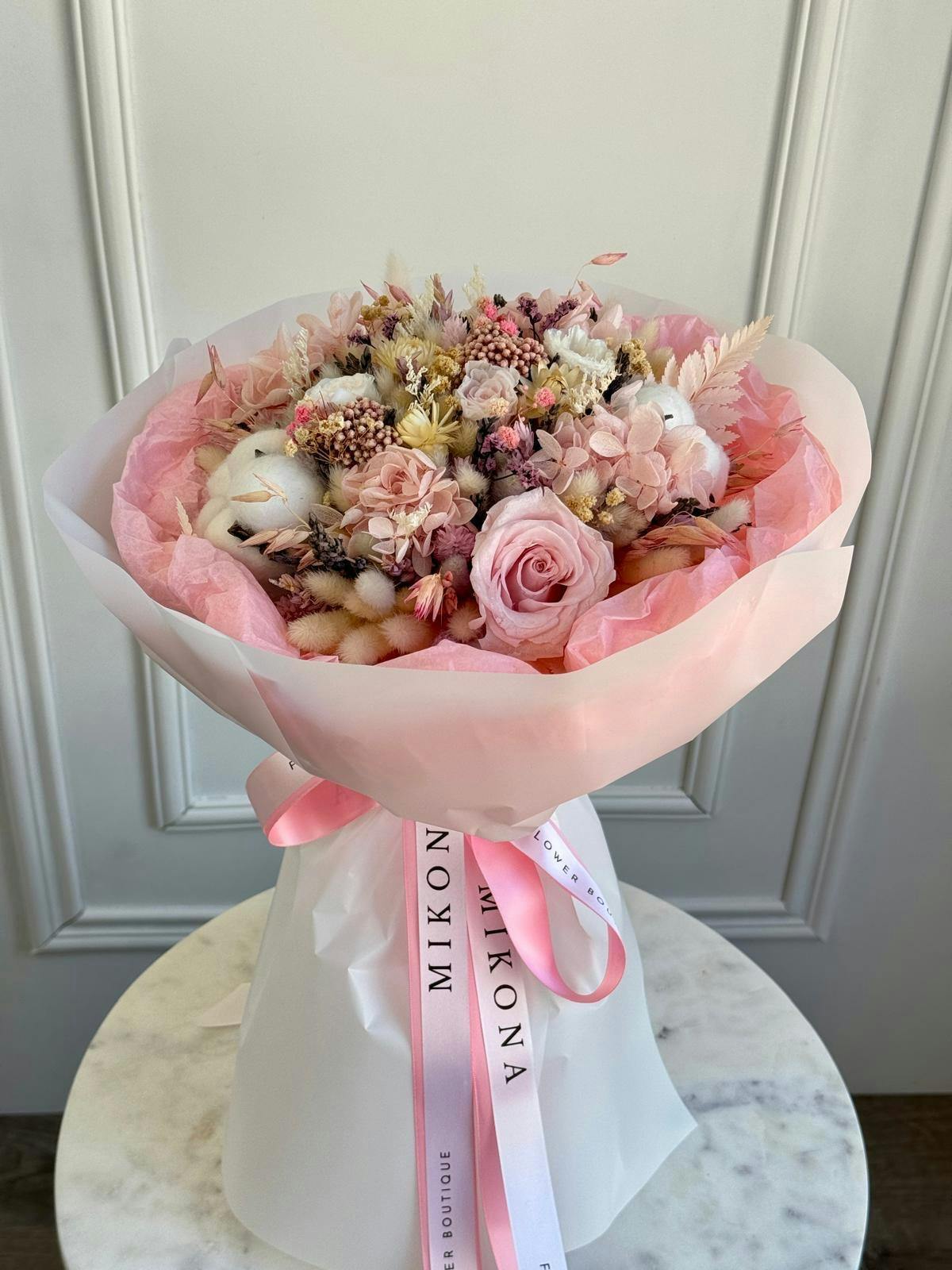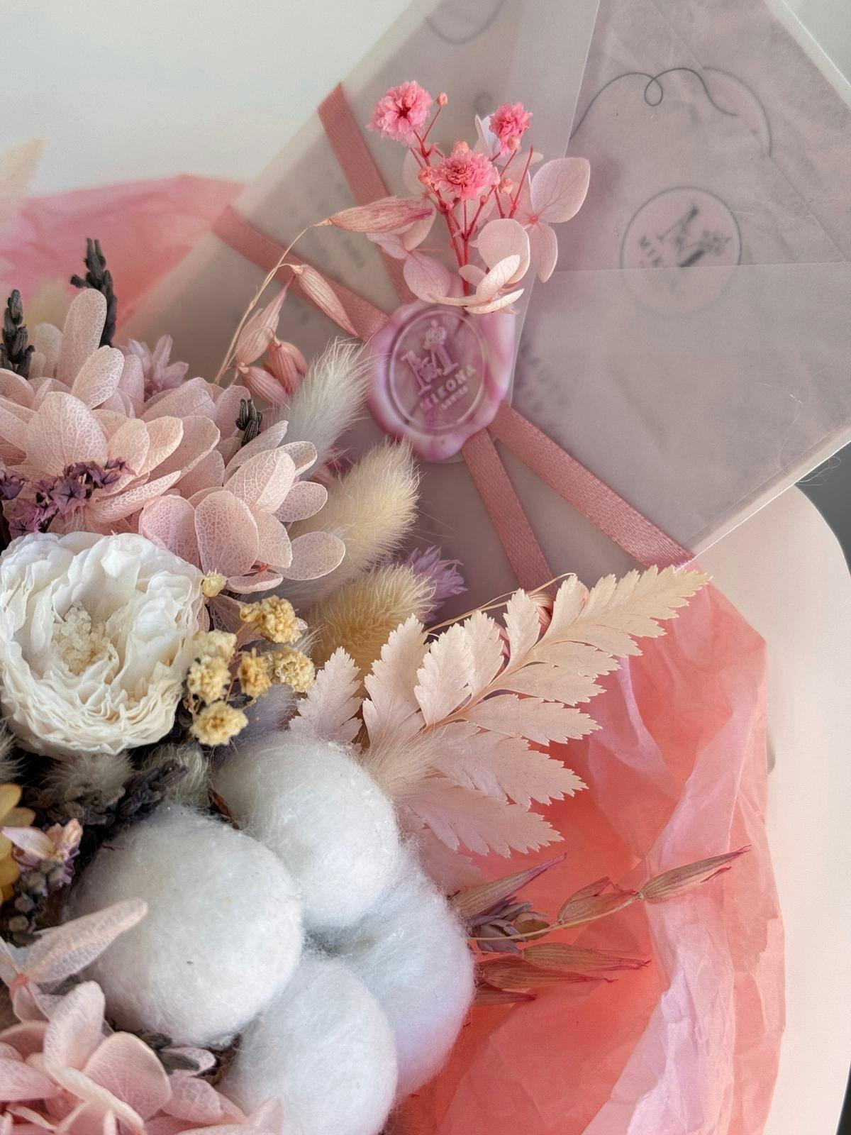 The bouquet features a stunning arrangement of dried flowers, showcasing a lovely mix of soft pinks, creams, and subtle purples. Delicate roses are interspersed with fluffy cotton blooms and intricate dried foliage, adding texture and depth. The overall composition has an elegant, whimsical feel, ideal for special occasions or as a unique home decor piece. The gentle colors and varied shapes create a romantic and inviting aesthetic, making it a beautiful accessory for any setting. The bouquet is tied with a soft ribbon, enhancing its charming appearance.